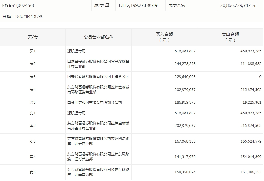 e公司讯,欧菲光今日涨8.7%,成交额208.66亿元,换手率34.82%。盘后龙虎榜数据显示,深股通专用席位买入6.16亿元并卖出4.51亿元。