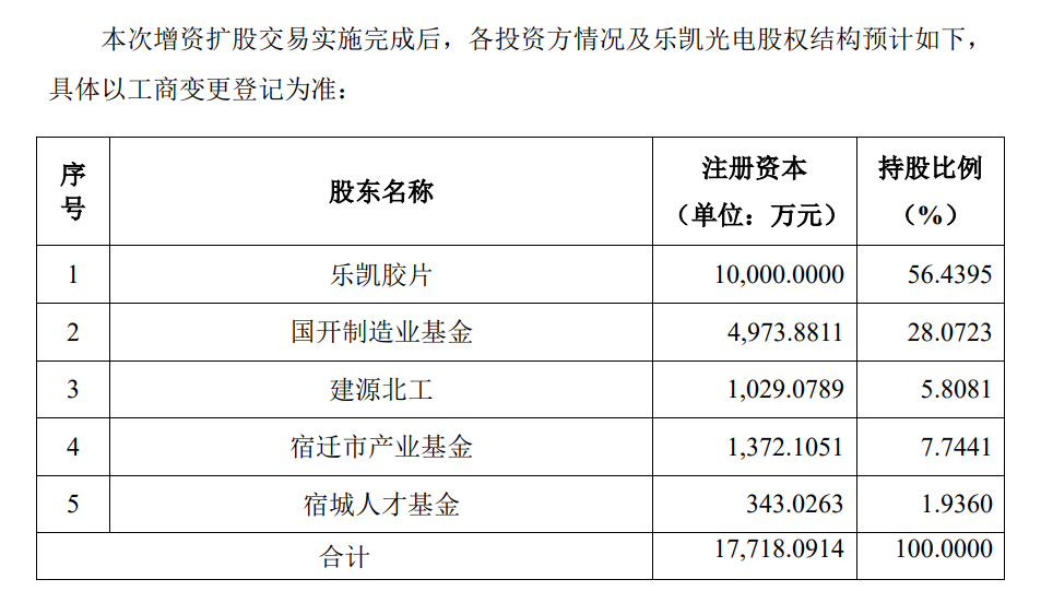 e公司讯,乐凯胶片(600135)11月12日晚间公告,公司子公司乐凯光电材料有限公司(简称“乐凯光电”)拟增资扩股,近日将与国开制造业基金、建源北工、宿迁市产业基金、宿城人才基金签署增资协议和股东协议,约定以现金方式向乐凯光电增资合计4.5亿元,认购乐凯光电7718.09万元的新增注册资本。公司不参与此次增资事项,完成后乐凯光电成为公司控股子公司。目前乐凯光电此次增资扩股尚在进行中。