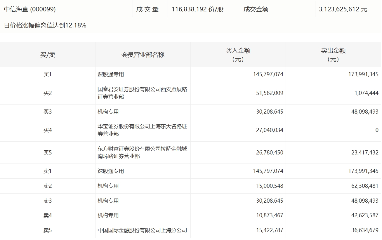 e公司讯,中信海直今日涨停,成交额31.24亿元,换手率15.06%,盘后龙虎榜数据显示,深股通买入1.46亿元并卖出1.74亿元,三机构净卖出9694.79万元。