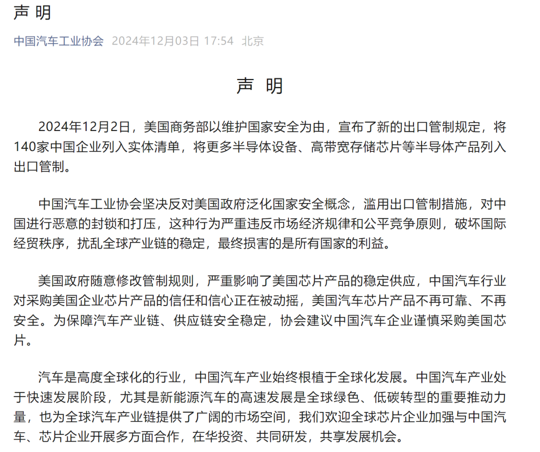 对此,12月3日,中国互联网协会、中国汽车工业协会、中国半导体行业协会、中国通信企业协会发布声明,呼吁或建议国内企业审慎选择采购美国芯片。