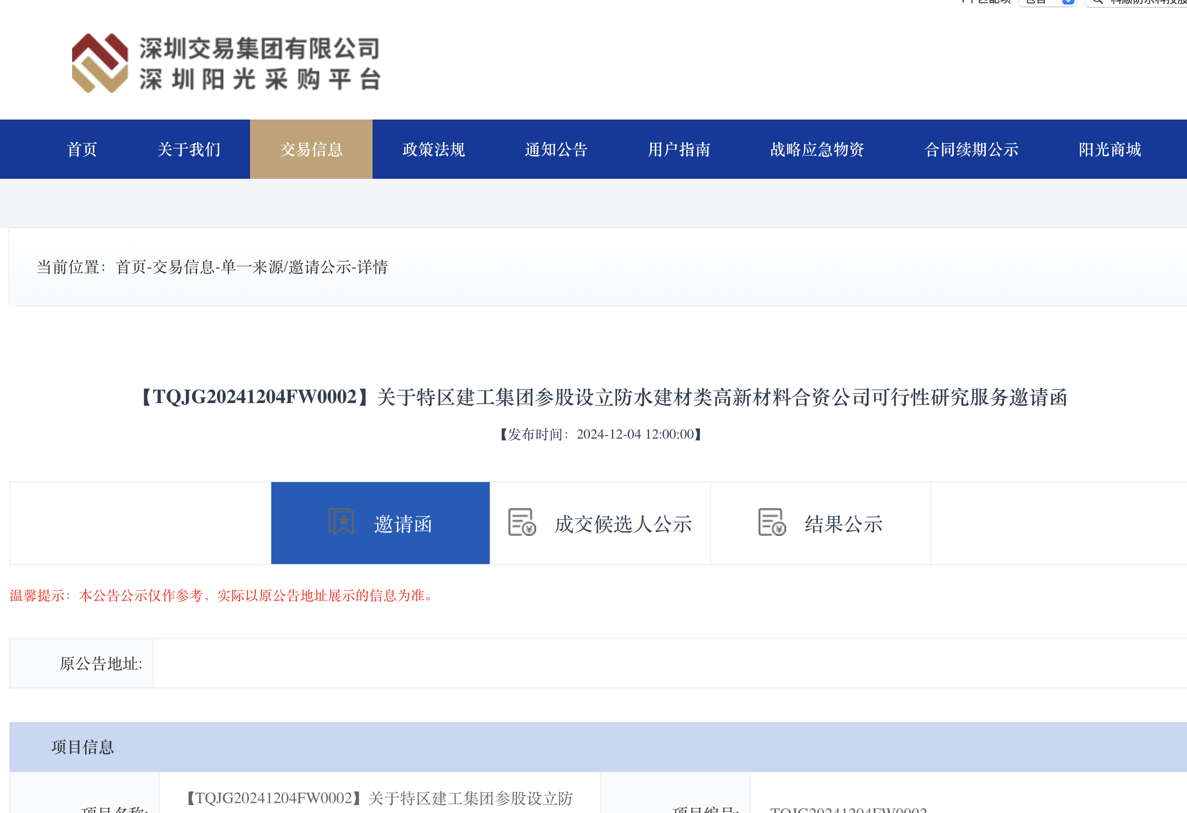 e公司讯,深圳阳光采购平台发布《关于特区建工集团参股设立防水建材类高新材料合资公司可行性研究服务邀请函》。特区建工集团拟以参股方式,与圣戈班(中国)投资有限公司、科顺股份(300737)及深圳市罗湖投资控股有限公司合作设立防水建材类高新材料合资公司。由于本项目为集团产业链拓展项目,且属于与非国有经济主体合资合作无实际控制权的项目,具有一定的专业性,特区建工集团拟通过邀请询价采购方式选聘专业中介机构对该事项开展可行性研究。