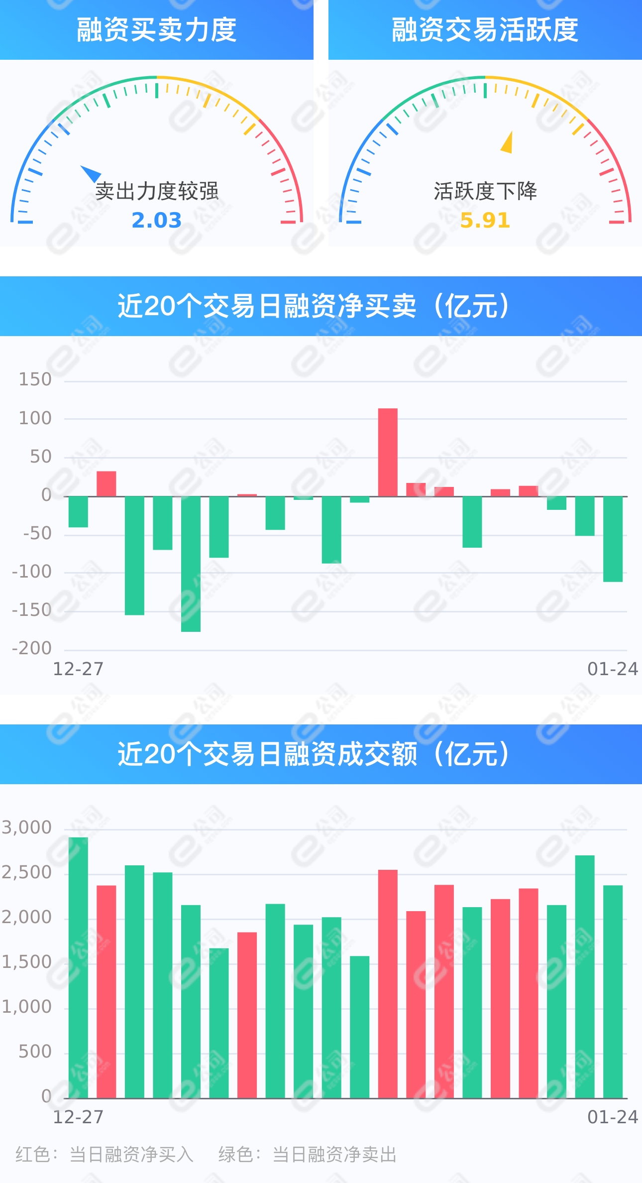 e公司讯,截至1月24日,上交所融资余额报9231.71亿元,较前一交易日减少62.83亿元;深交所融资余额报8719.20亿元,较前一交易日减少48.86亿元;两市合计17950.91亿元,较前一交易日减少111.69亿元,融资交易额2370.99亿元,占A股成交额19.40%,其中融资买入额1129.65亿元,融资偿还额1241.34亿元,交易活跃度下降12.38%。