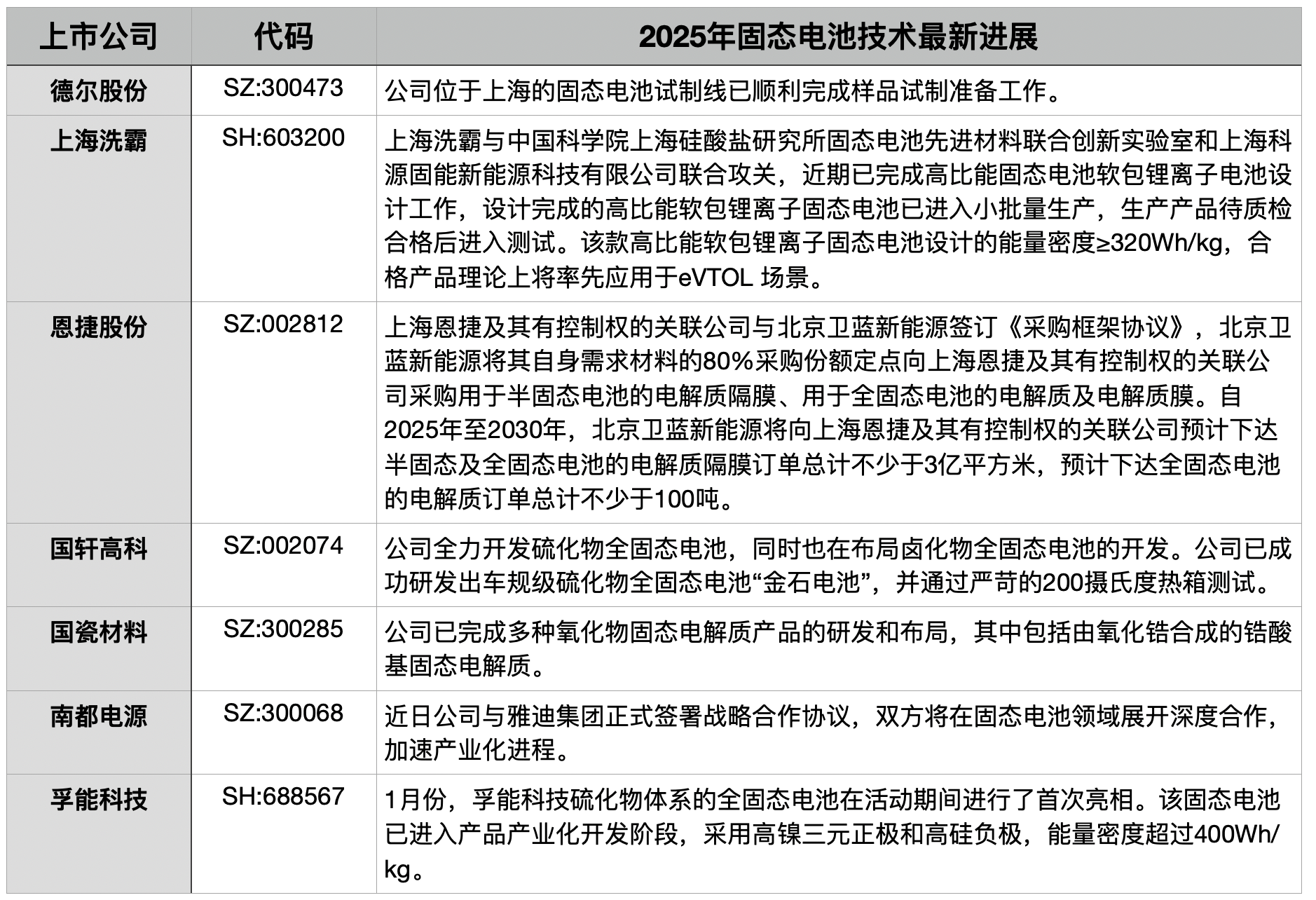 从上市公司来看,据证券时报梳理,2025年已有多家A股公司公布最新业务进展。其中,德尔股份迎来了固态电池研发进程中的重要里程碑——其位于上海的固态电池试制线已顺利完成样品试制准备工作;恩捷股份与北京卫蓝新能源就全固态电池电解质等相关产品达成长期供货协议;上海洗霸应用于eVTOL的高比能软包锂离子固态电池已设计完成;国轩高科成功研发车规级硫化物全固态电池“金石电池”;国瓷材料已完成多种氧化物固态电解质产品的研发和布局,其中包括由氧化锆合成的锆酸基固态电解质。
