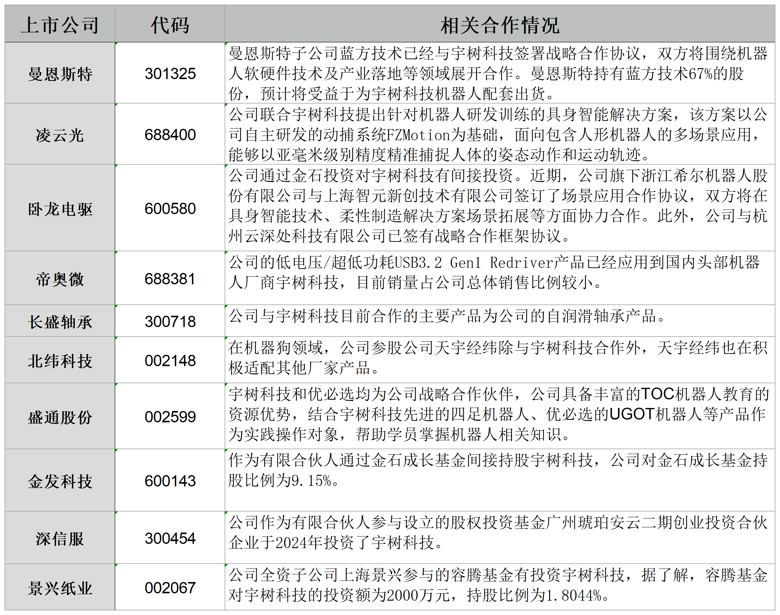 宇树科技是一家具身智能创业公司,公司全球首家公开零售高性能四足机器人,并实现全球销量领先。梳理发现,目前A股有多家上市公司与宇树科技展开合作。
