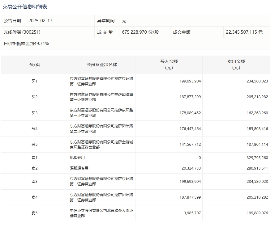 光线传媒日价格振幅达49.71% 一机构卖出3.3亿元