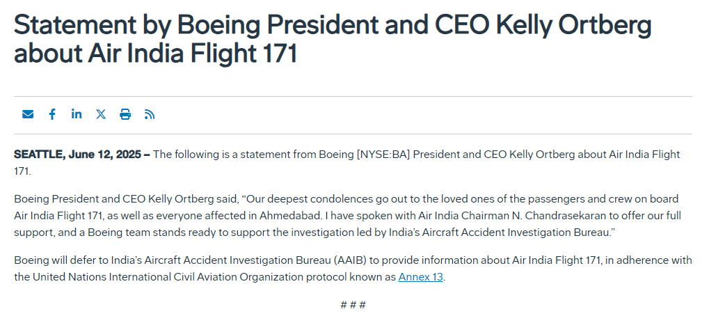 人民财讯6月13日电,波音公司官网发布“波音总裁兼首席执行官凯利·奥特伯格关于印度航空171航班的声明”。声明中提到,波音总裁兼首席执行官凯利·奥特伯格表示:“我们向印度航空171航班机上乘客和机组的亲友,以及所有在艾哈迈达巴德受到影响的人们致以最深切的慰问 。我已经与印度航空董事长N·钱德拉塞卡兰通话,表示我们将提供全力支持,同时一支波音团队已就绪,随时准备支持由印度飞机事故调查局领导的调查工作。”波音将遵循国际民航组织的《国际民用航空公约》附件13的规定,关于印度航空171航班的信息需由印度飞机事故调查局发布。