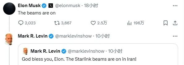 马斯克在社交平台表示,“星链”卫星通信系统已经激活,该系统已在伊朗投入使用。