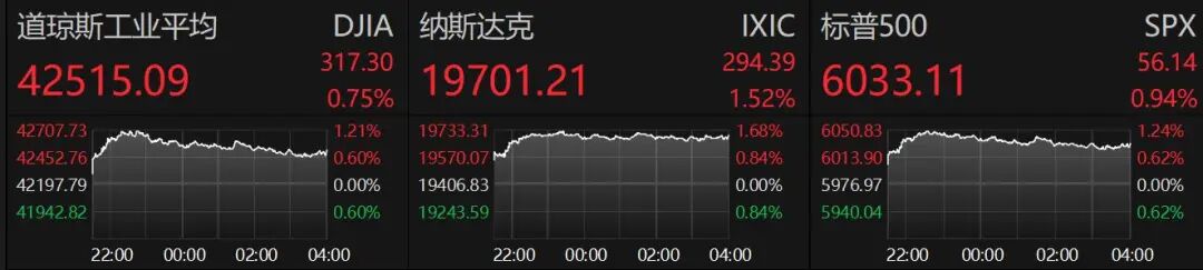 6月16日,美股高开高走,三大指数集体收涨,纳指涨1.52%,标普500指数涨0.94%,道指涨0.75%。