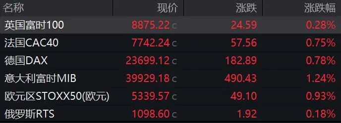 欧洲股指集体收涨。