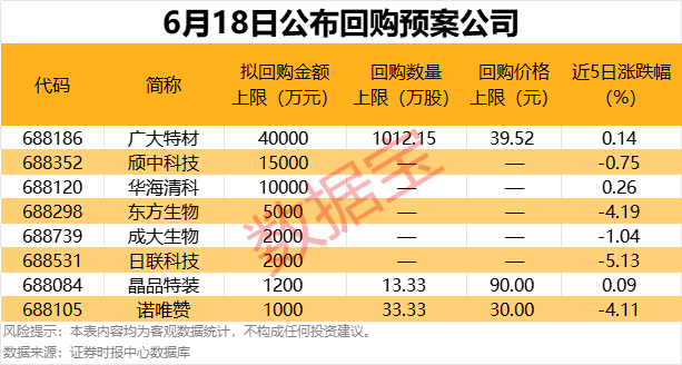 人民财讯6月18日电,6月18日8家科创板公司披露回购计划,多数为公司董事长、实控人或总经理等提议回购,按拟回购金额上限统计,广大特材、颀中科技、华海清科拟回购金额上限超亿元。