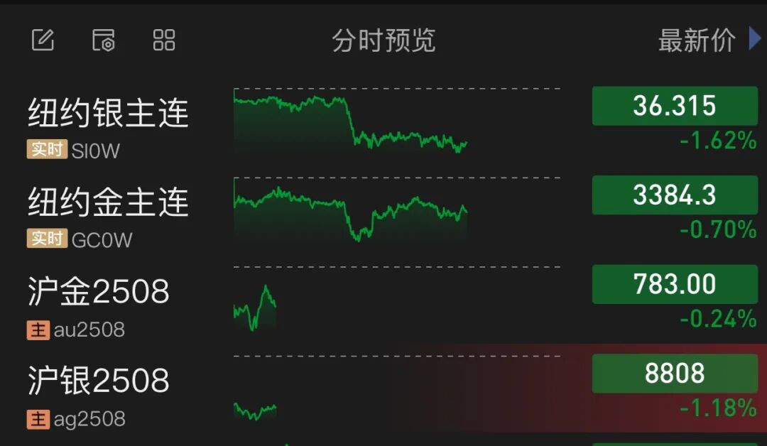 黄金、白银也下跌。截至发稿,纽约银期货主力合约跌幅为1.62%。