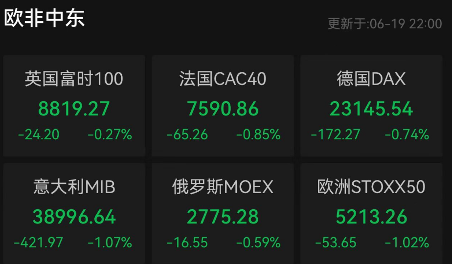 欧洲股市纷纷飘绿,欧洲STOXX50指数、意大利MIB指数均跌超1%。