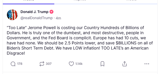 特朗普通过社交媒体平台表示,“太迟先生”鲍威尔(美联储主席)正在让美国损失数千亿美元。他写道:“欧洲已经降息10次了,我们一次也没有。我们应该降低2.5个百分点,这样(前总统)拜登的所有短期债务就能省下数十亿美元。我们的通胀率很低!‘太迟先生’是美国的耻辱!”