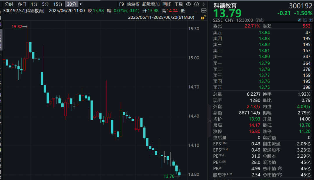 对于本次股权转让终止的原因,公告中并未明确提及。6月20日,科德教育最新收盘价为13.79元/股,低于此前拟转让股份的价格。