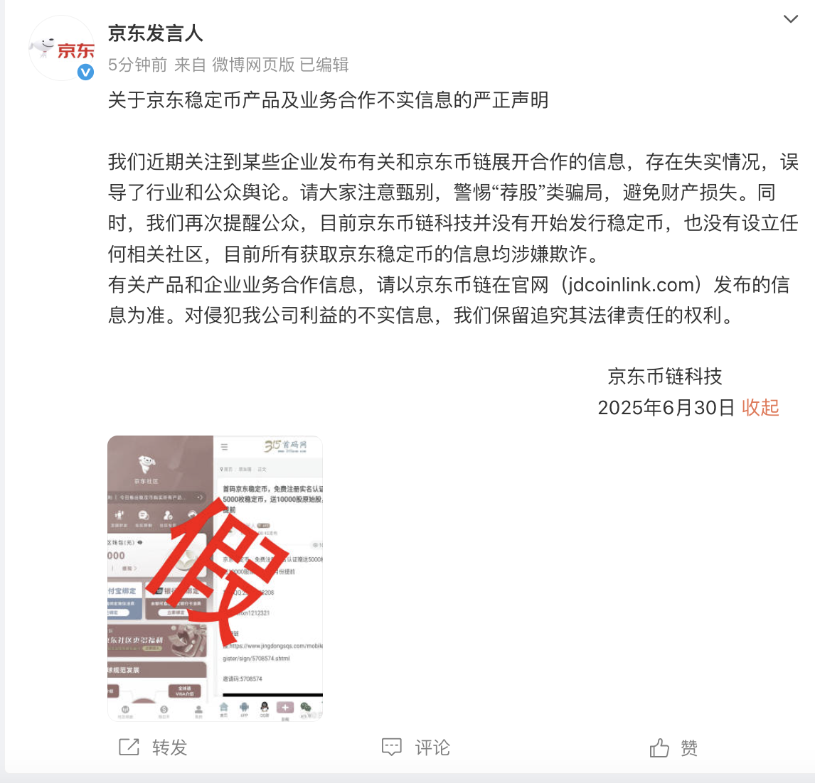人民财讯6月30日电,据京东发言人微博,京东币链科技发布声明称,公司近期关注到某些企业发布有关和京东币链展开合作的信息,存在失实情况,误导了行业和公众舆论。请大家注意甄别,警惕“荐股”类骗局,避免财产损失。同时,公司再次提醒公众,目前京东币链科技并没有开始发行稳定币,也没有设立任何相关社区,目前所有获取京东稳定币的信息均涉嫌欺诈。