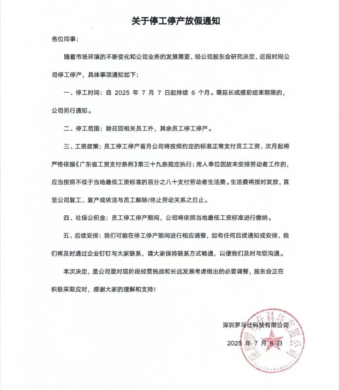 通知称,随着市场环境的不断变化和公司业务的发展需要,经公司股东会研究决定,近段时间公司停工停产。停工时间为自2025年7月7日起持续6个月。除召回相关员工外,其余员工停工停产。这期间,员工停工停产首月公司将按照约定的标准正常支付员工工资,次月起将依据当地最低工资标准的百分之八十支付劳动者生活费。社保公积金:员工停工停产期间,公司将依照当地最低工资标准进行缴纳。7月5日,多位罗马仕员工告诉界面新闻记者,他们想去深圳办公室拿取私人物品时,发现自己的门禁权限已被取消。