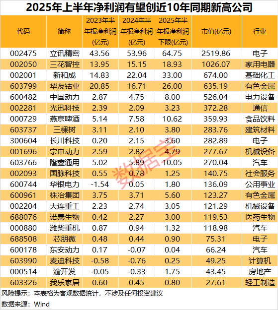 人民财讯7月7日电,7月7日晚间,华友钴业、燕京啤酒、工业富联等公司集体公布2025年半年报业绩预告。截至2025年7月7日晚19点,近70家披露业绩预告的公司中,按照预告下限计算,2025年上半年净利润有望创近10年同期新高的公司有21家,这其中既有市值超千亿元的立讯精密、三花智控,也有市值低于百亿元的芯朋微、渝开发等公司。其中,麦迪科技、渝开发有望实现同比扭亏;华银电力、三棵树、宗申动力及燕京啤酒2025年上半年净利润下限均超过2024年全年净利润水平。