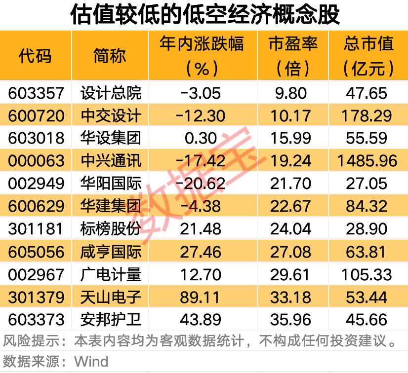 从估值上来看,剔除负值后低空经济概念股滚动市盈率中位数为56.96倍,目前低估值的概念股相对稀缺,仅有设计总院、中交设计、华设集团、中兴通讯4股最新滚动市盈率不足20倍,其中设计总院、中交设计、华设集团均属于建筑装饰行业个股。
