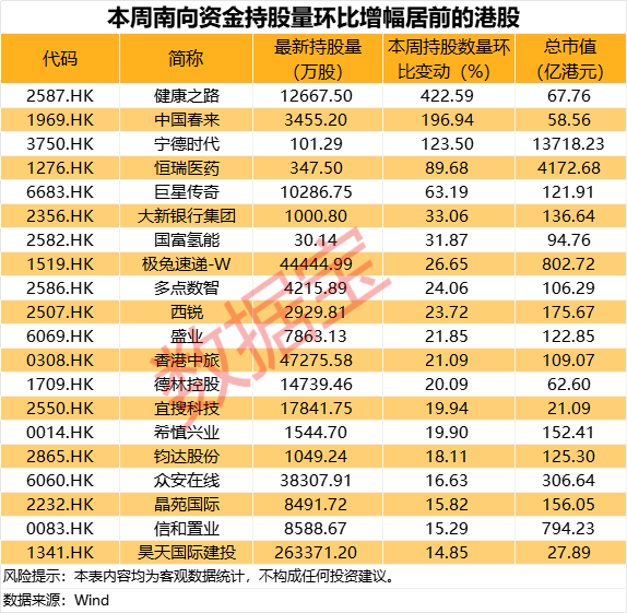 从持股量变化来看,本周33股获得南向资金持股量环比增长超10%,其中健康之路、中国春来、宁德时代持股量环比实现翻倍,获得南向资金大幅度加仓;恒瑞医药、巨星传奇持股量增幅在60%以上。