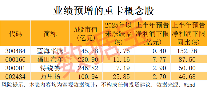 截至目前,仅有6只重卡概念股公布了2025年半年度业绩预告。按照预告净利润下限计算,蓝海华腾、福田汽车、特锐德、万里扬净利润预计同比实现增长,预计增速均超过45%。