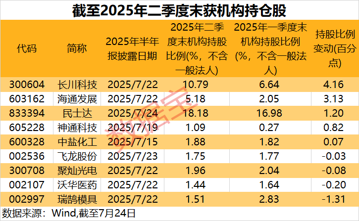 人民财讯7月24日电,截至7月24日,已有11家公司披露2025年半年报。Wind口径下,截至2025年二季度末,机构(不含一般法人)环比加仓的公司有5家,长川科技、海通发展、民士达加仓幅度位居前3位,其中长川科技获机构加仓超过4个百分点,2025年半年报中,第六、第八及第九大流通股东“易方达创业板ETF”“南方中证500ETF”及“国联安中证全指半导体ETF”均增持了公司的流通股本。另外2家获机构环比加仓公司为神通科技、中盐化工。这11家公司公司中,仅沃华医药获合格境外机构投资者(QFII)加仓,截至2025年二季度末,QFII持股比例1.09%,环比加仓0.76个百分点,其中“瑞士联合银行集团”新进成为公司第三大流通股东,第五大流通股东“摩根士丹利国际股份有限公司”及第十大流通股东“巴克莱银行有限公司”均增持了公司的流通股本。