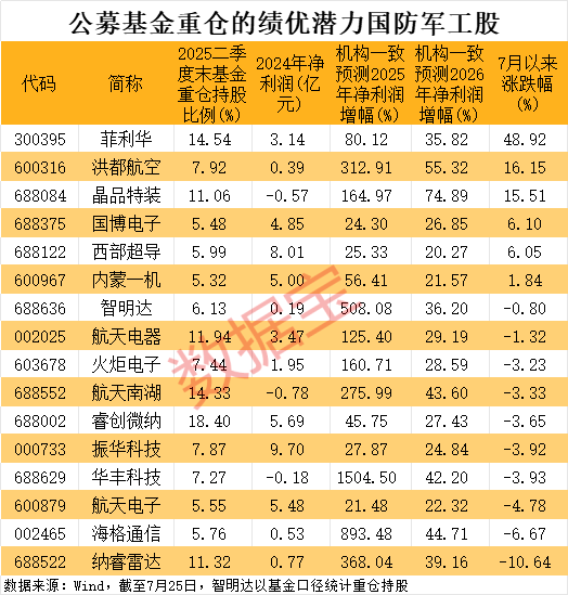 结合公募基金重仓持股以及业绩增长潜力两个维度来看,上述22只个股中,机构一致预测2025年、2026年净利润增幅超过20%的有16只,其中有9只个股获机构一致预测2025年净利润增幅超过100%,包括智明达、纳睿雷达、洪都航空等。