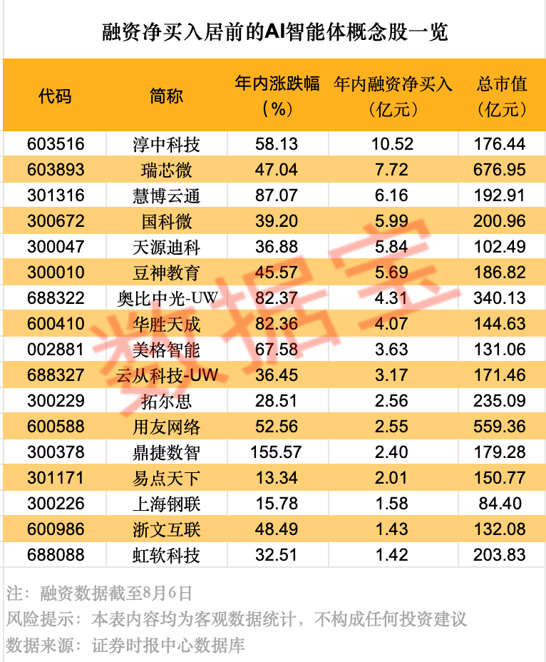 从资金加仓角度来看,截至8月6日,今年以来多只概念股获融资资金净买入超1亿元。其中,融资资金净买入淳中科技、瑞芯微、慧博云通和国科微等个股均超5亿元。