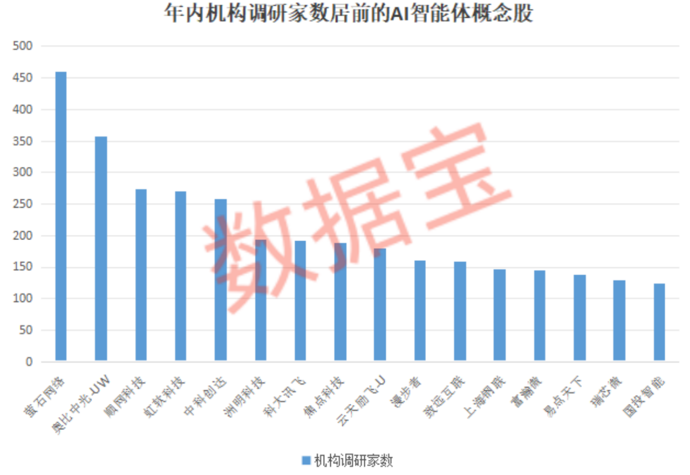 A股中,AI智能体相关概念股超80只,其中16股年内均获超百家机构调研。萤石网络、奥比中光-UW、顺网科技、虹软科技、中科创达均获超250家机构调研。