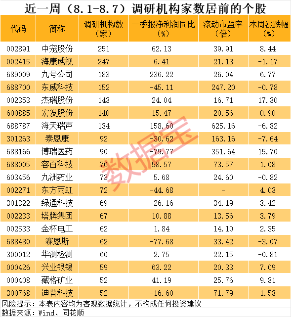 人民财讯8月10日电,近一周机构调研个股数量有110多只,中宠股份调研机构数最多。中宠股份有251家机构调研,其中包括52家基金公司、59家证券公司、61家私募、10家保险公司等。海康威视近一周获得247家机构调研。