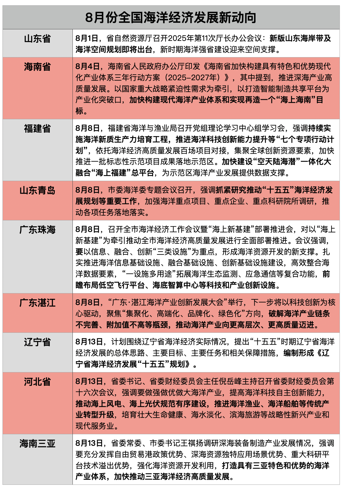 从地方来看,8月份以来,全国多地向海图强,加快海洋经济高质量发展。其中,新版山东海岸带及海洋空间规划即将出台;辽宁省计划编制《辽宁省海洋经济发展“十五五”规划》;海南省提出加快构建现代海洋产业体系和实现再造一个“海上海南”目标。