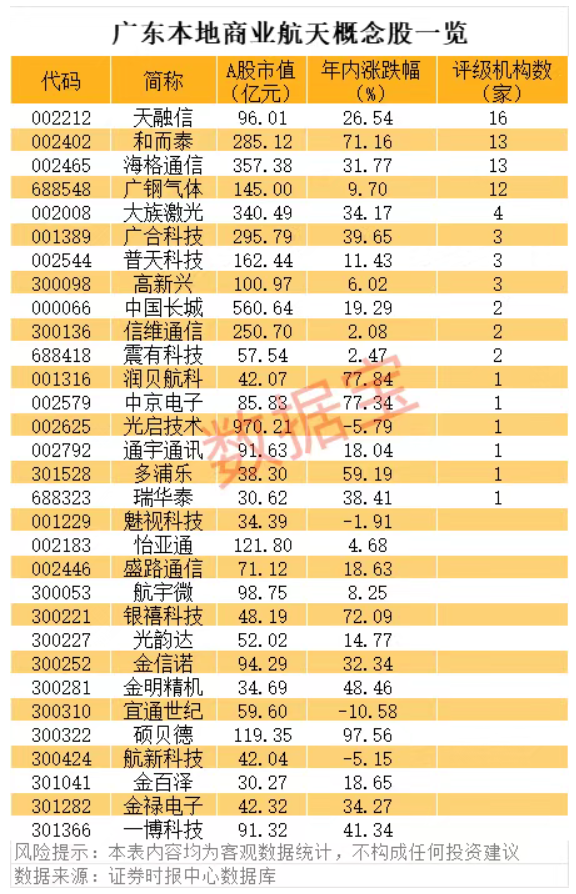 人民财讯8月19日电,广东省人民政府办公厅印发《广东省推动商业航天高质量发展若干政策措施(2025—2028年)》的通知。广东本地商业航天概念股有望受益。据证券时报·数据宝统计,属于广东省的商业航天概念股合计有31只,其中天融信、和而泰、海格通信、广钢气体等个股评级机构数较多。从概念相关性来看,海格通信、普天科技、信维通信等个股机构研报提及相关业务布局。