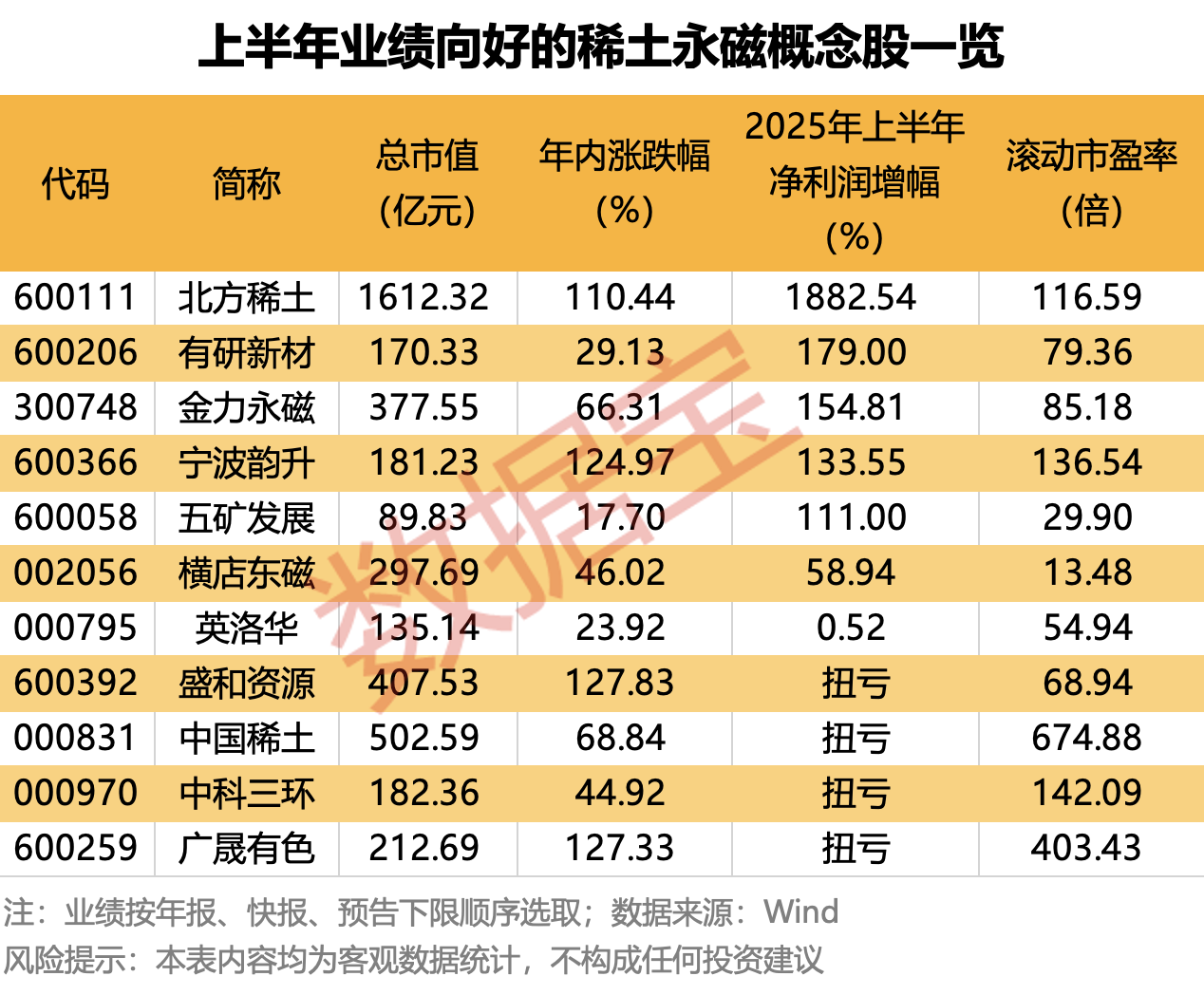 据证券时报·数据宝统计,截至8月21日,已有14家稀土永磁个股发布上半年业绩数据(含预告、快报和年报),多数公司业绩预增或扭亏。龙头股北方稀土净利润更是同比暴增超18倍。
