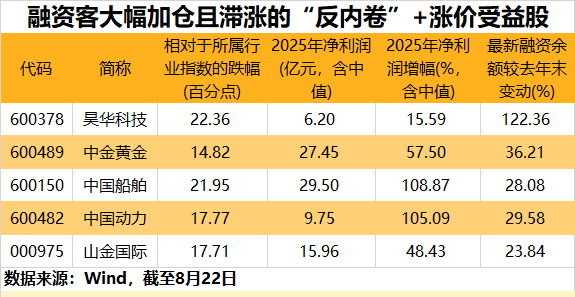 结合行业来看,“反内卷”+涨价受益股中,截至8月22日,年内跑输所属的申万行业,且最新融资余额较去年末加仓幅度超过20%的个股仅有5只,按照加仓幅度排序,分别为昊华科技、中金黄金、中国船舶、中国动力、山金国际,其中昊华科技获融资客加仓超过120%。