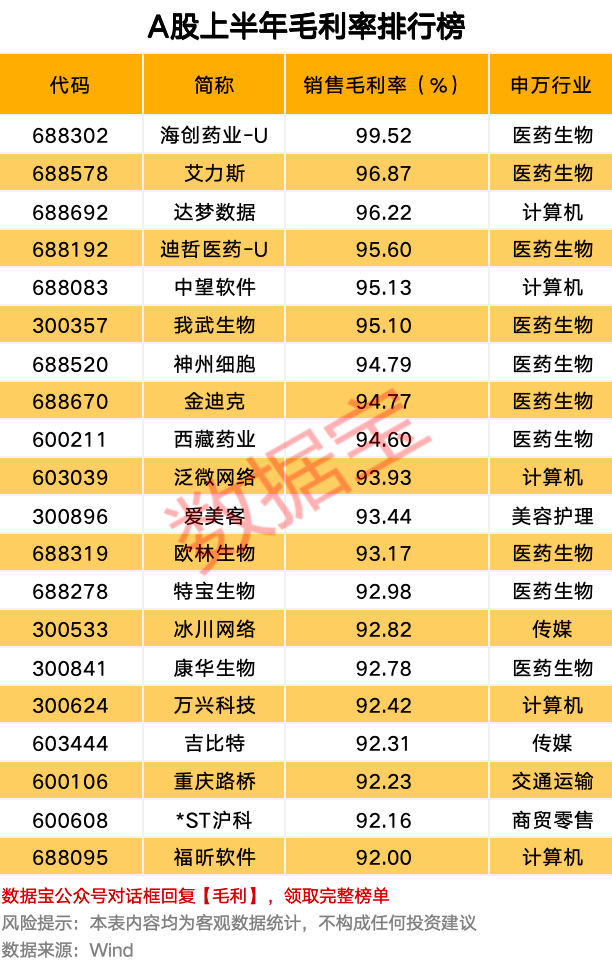 从个股来看,销售毛利率居前的以医药生物和计算机行业个股居多,上半年毛利率前五名依次是海创药业-U、艾力斯、达梦数据、迪哲医药-U、中望软件。海创药业-U以99.52%的销售毛利率排名第一,上半年毛利率在90%以上的个股有27只。