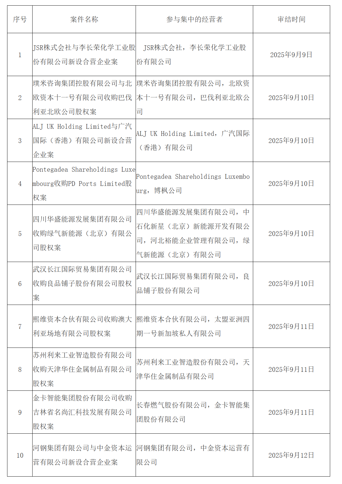 市场监管总局发布2025年9月8日—9月14日无条件批准经营者集中案件列表