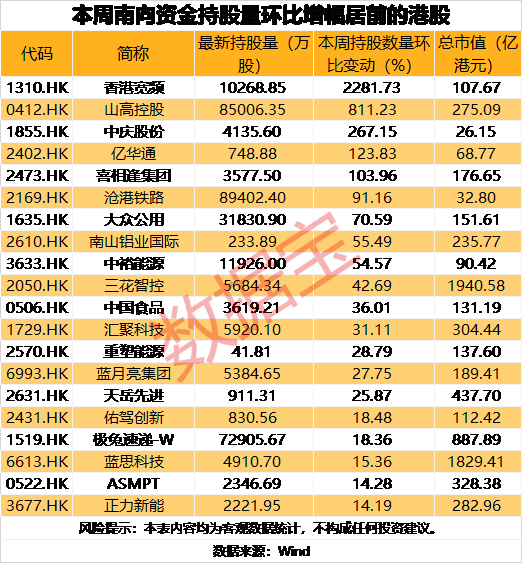 人民财讯9月28日电,近一周(9月22日—9月26日)27股获得南向资金持股量环比增长超10%,其中5股获得南向资金持股量环比增长超100%,香港宽频居首,环比增长2281.73%,其他还有山高控股、中庆股份、亿华通、喜相逢集团持股量环比增长100%以上,获得南向资金大幅度加仓。