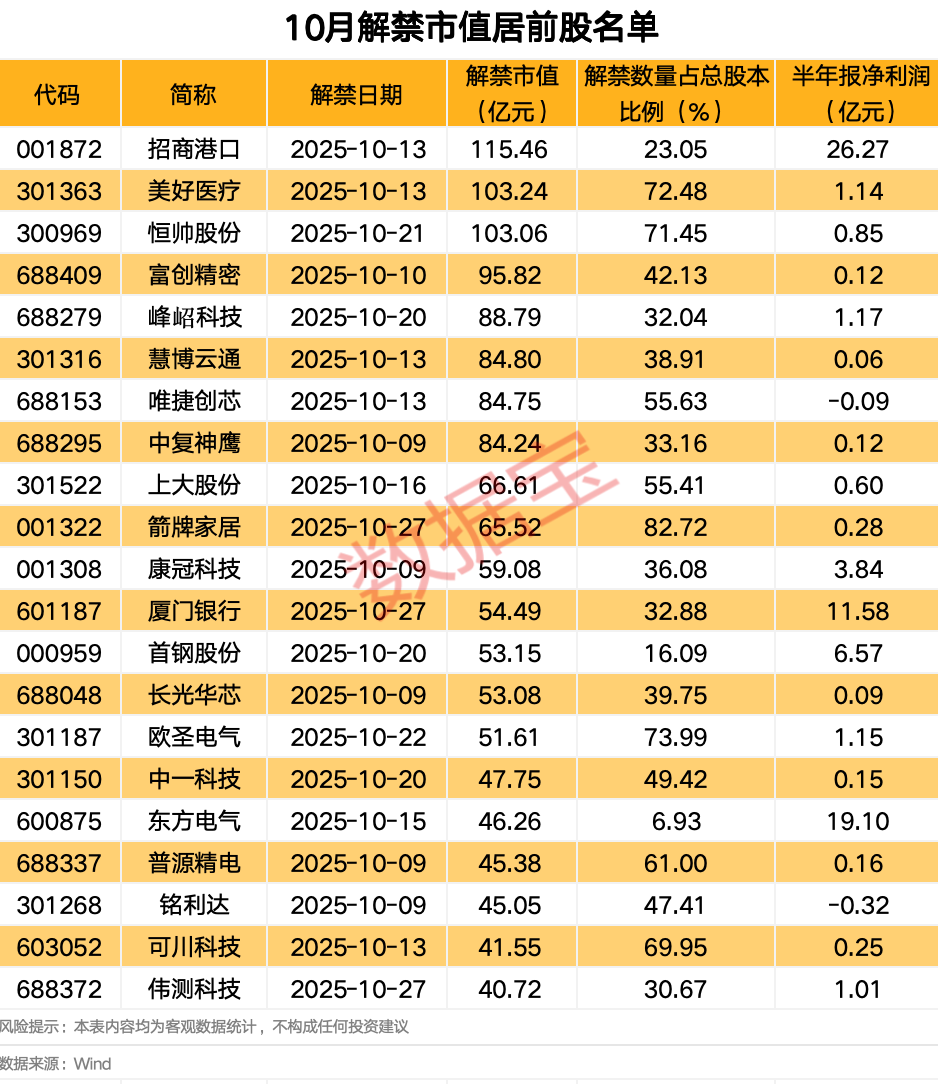 一般而言,解禁的利空影响对于业绩亏损或下滑的个股要显著大于绩优股。10月面临解禁的个股中有22股上半年业绩亏损,其中迪哲医药-U、佰维存储、云煤能源、星环科技-U等6股上半年净利润亏损幅度居前。