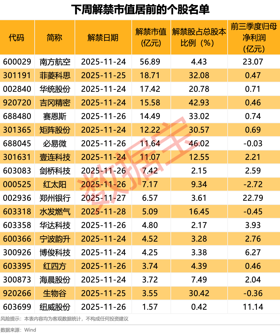 人民财讯11月22日电,下周将有38股解禁,按照最新收盘价计算,合计解禁市值216.78亿元。南方航空下周将有8.04亿股上市流通,主要为定向增发机构配售股份,解禁市值达56.89亿元。菲菱科思的解禁规模次之,下周将有0.22亿股上市流通,解禁股主要为首发原股东限售股份,解禁市值达18.71亿元。相比之下,华洋赛车、奥特维、天奈科技、奥普科技等8股的解禁压力较小,解禁市值均不足千万元。一般而言,业绩亏损股的解禁压力相对较大,下周的解禁股中,红太阳、水发燃气、中望软件、生物谷、久其软件、必易微前三季度业绩呈现亏损。