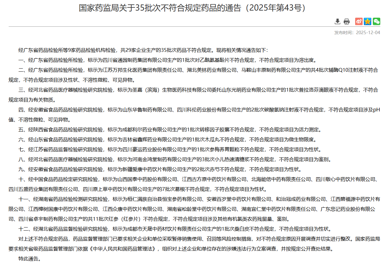 人民财讯12月4日电,国家药监局消息,经广东省药品检验所等9家药品检验机构检验,共29家企业生产的35批次药品不符合规定。对上述不符合规定药品,药品监督管理部门已要求相关企业和单位采取暂停销售使用、召回等风险控制措施,对不符合规定原因开展调查并切实进行整改。国家药监局要求相关省级药品监督管理部门依据《中华人民共和国药品管理法》,组织对上述企业和单位存在的涉嫌违法行为立案调查,并按规定公开查处结果。