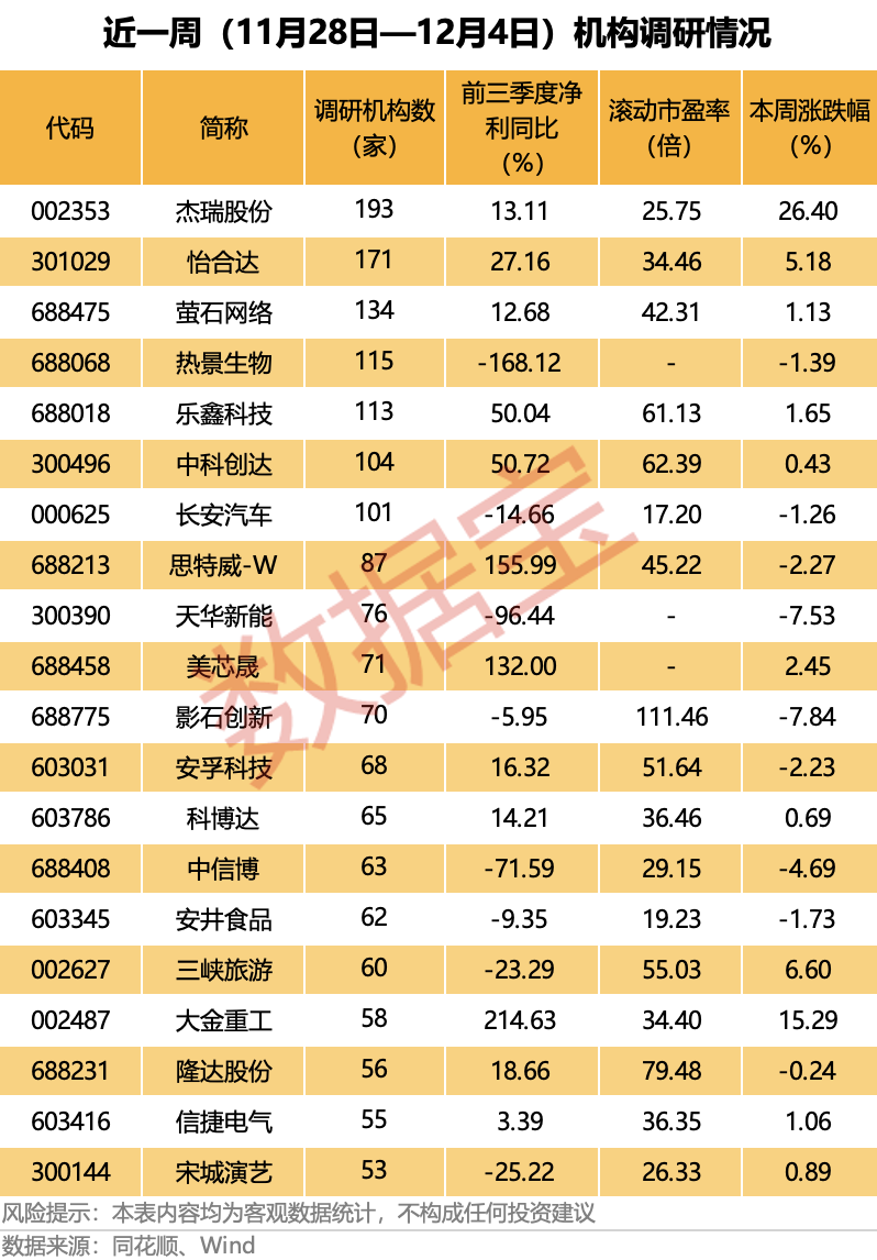 人民财讯12月7日电,近一周(11月28日—12月4日)机构调研个股有380多只,杰瑞股份调研机构数最多。杰瑞股份有193家机构调研,其中包括57家基金公司、48家证券公司、29家私募、13家保险公司以及16家海外机构。