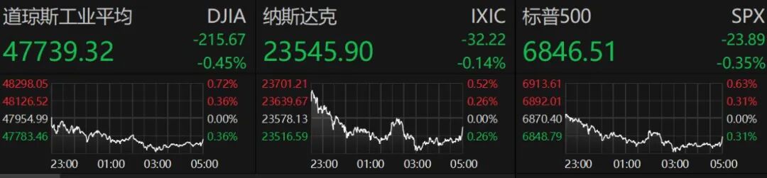 截至收盘,美股三大指数集体下跌,道指跌0.45%,纳指跌0.14%,标普500指数跌0.35%。