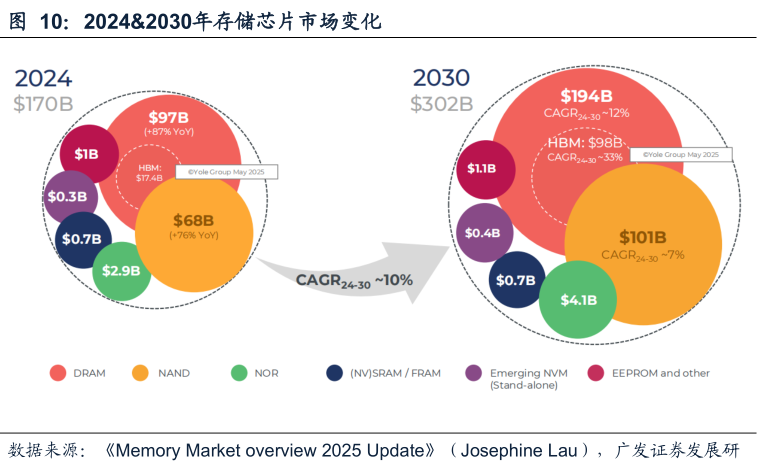 在AI的带动下HBM到2030年将增长至到980亿美元,CAGR约33%。