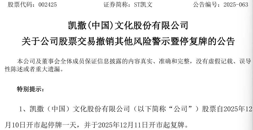 公司股票自2025年12月10日开市起停牌一天,并于2025年12月11日开市起复牌。公司股票自2025年12月11日开市起复牌撤销其他风险警示,公司股票简称由“ST凯文”变更为“凯撒文化”,股票代码仍为“002425”,股票交易日的涨跌幅限制由“5%”变为“10%”。