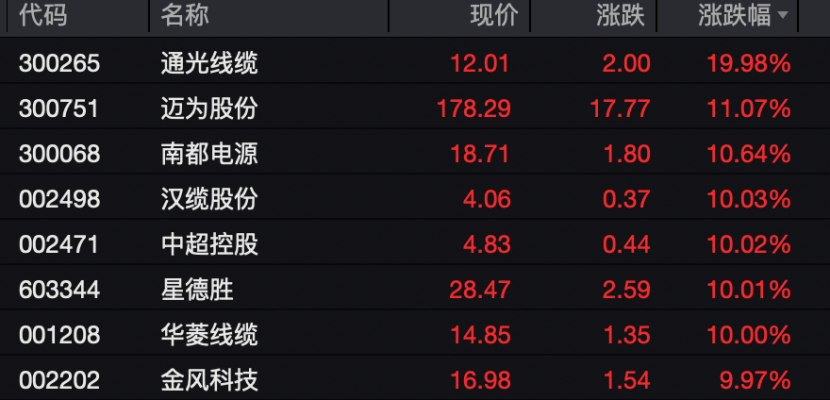 从行业和赛道来看,若按照申万一级行业划分,电力设备板块领涨,板块内个股掀起涨停潮。通光线缆盘中“20cm”涨停,迈为股份、南都电源等盘中涨幅超过10%,汉缆股份、中超控股、星德胜、华菱线缆等多股盘中涨停。