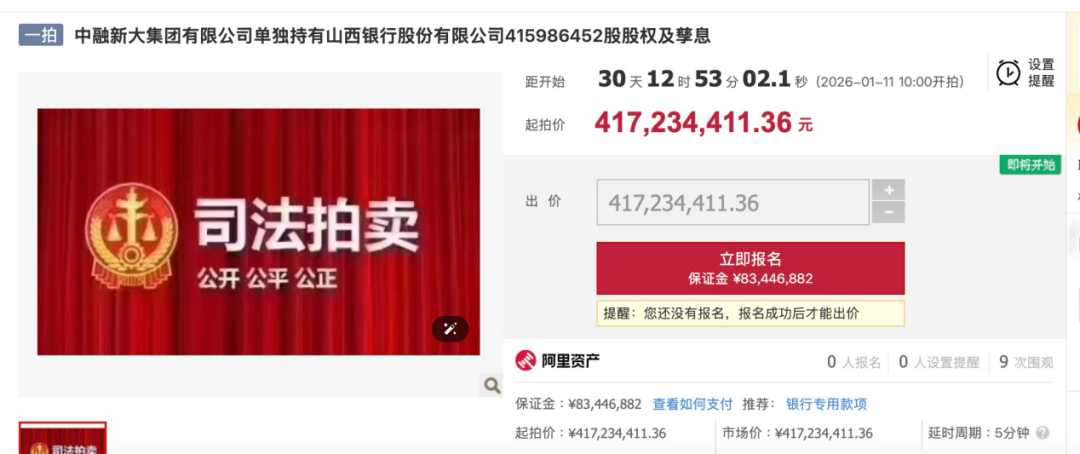 值得一提的是,从起拍价来看,中融新大集团持有的约4.16亿股山西银行股权并未折价出售,与市场评估价相同,拍卖日期定于2026年1月11日。