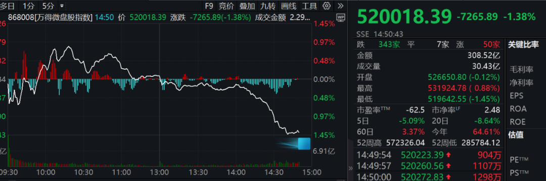 午后,A股市场一度冲高。但微盘股在下午两点过后也开启了显著杀跌之旅。万得微盘股指数一度杀跌超1.4%。不少上午存有一定涨幅的中小盘个股午后皆出现显著杀跌。