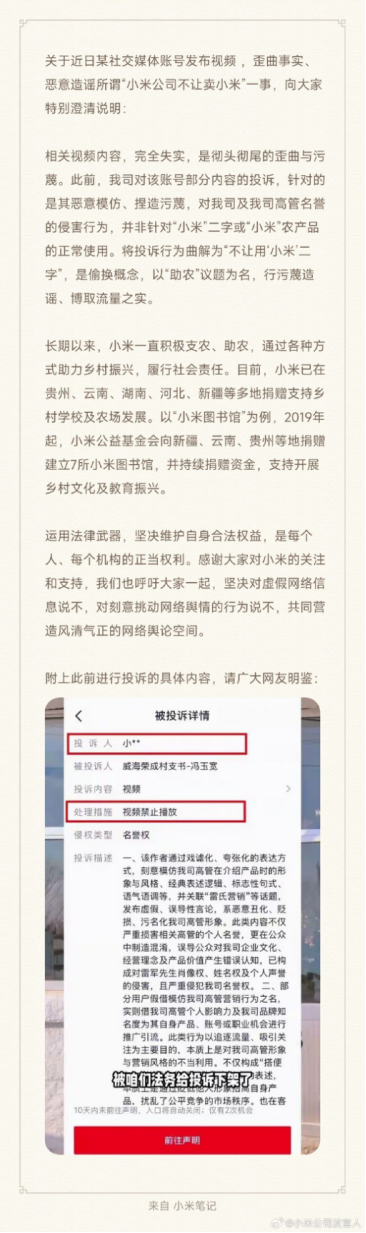 此前,小米公司就曾对该账号部分内容的投诉,针对的是其恶意模仿、捏造污蔑,对公司及公司高管名誉的侵害行为,并非针对“小米”二字或“小米”农产品的正常使用。将投诉行为曲解为“不让用‘小米’二字”,是偷换概念,以“助农”议题为名,行污蔑造谣、博取流量之实。