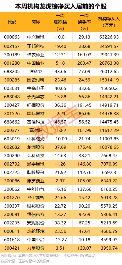 龙虎榜数据显示,本周机构专用席位共现身121股的龙虎榜,净买入60股,净卖出61股。其中,净买入金额在1亿元以上的有14只。
