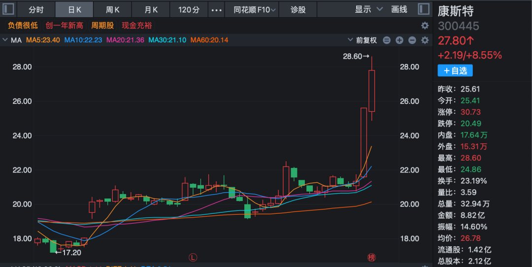 3个交易日股价大涨32%的康斯特(300445)12月15日发布公司股票交易异常波动公告,公司股票交易连续2个交易日内收盘价格涨幅偏离值累计达到30.78%,属于股票交易异常波动情形。