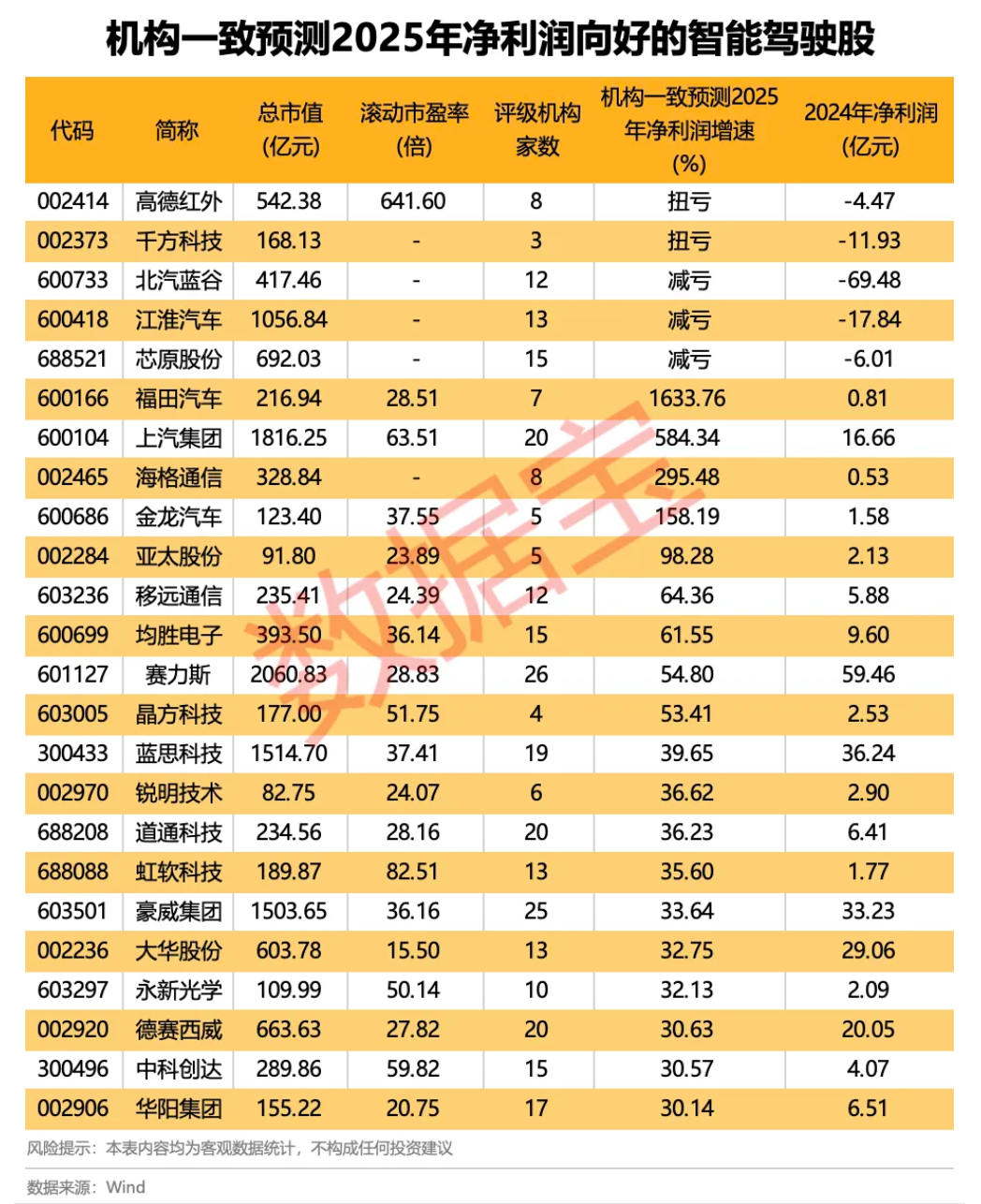 根据3家及以上机构一致预测,在2024年同期盈利的基础上,2025年全年净利润增速有望超过30%的智能驾驶股共计19只。福田汽车、上汽集团、海格通信、金龙汽车净利润增长翻倍,同比增速依次为1633.76%、584.34%、295.48%、158.19%。此外,高德红外、千方科技等则有望扭亏为盈。